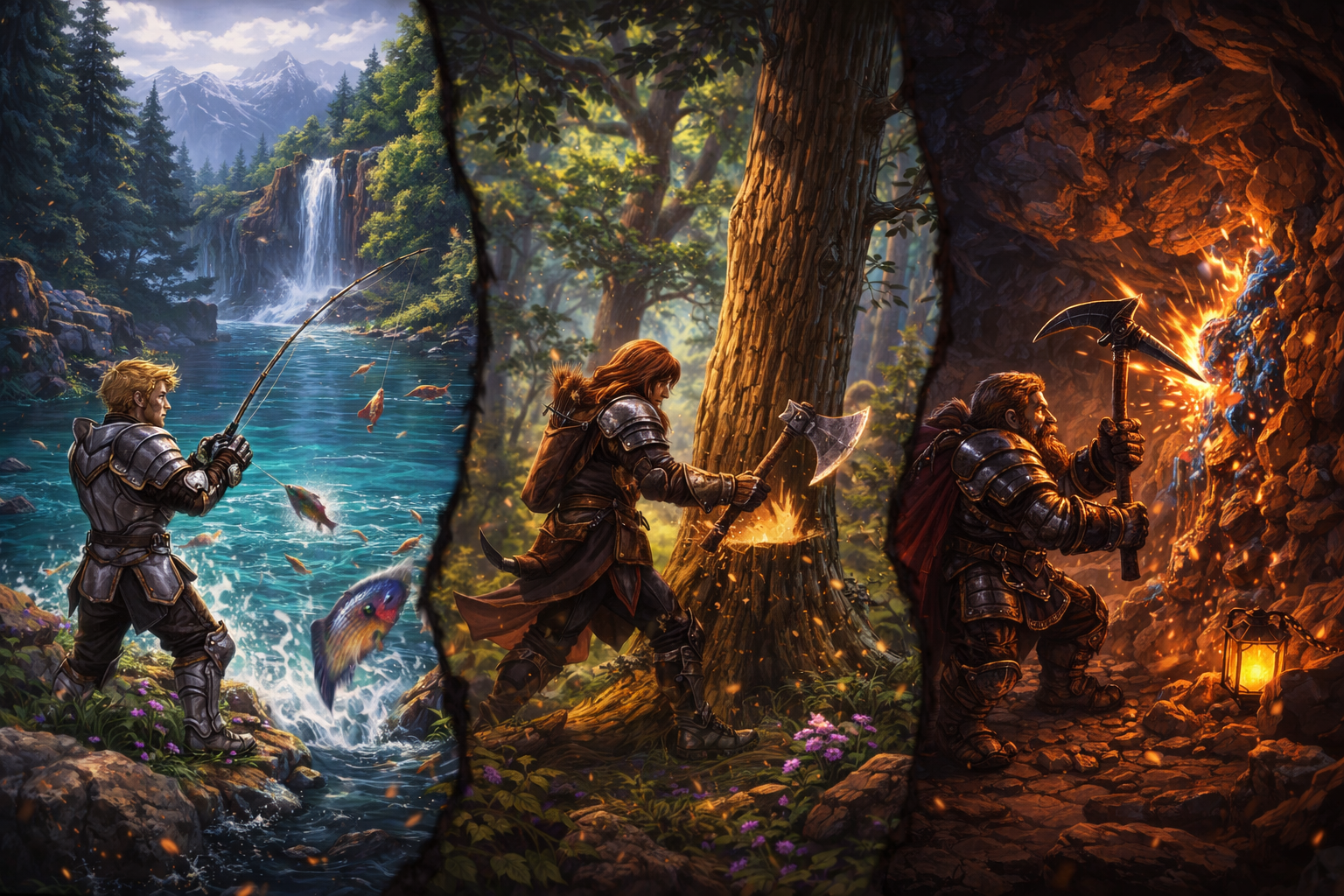 Cast your line into glittering waters. Swing your axe at ancient trees. Strike ore veins deep in the mines. The world is full of riches — go claim them.